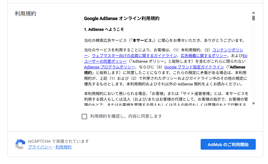 Google AdMobの利用規約を確認し、同意してください。