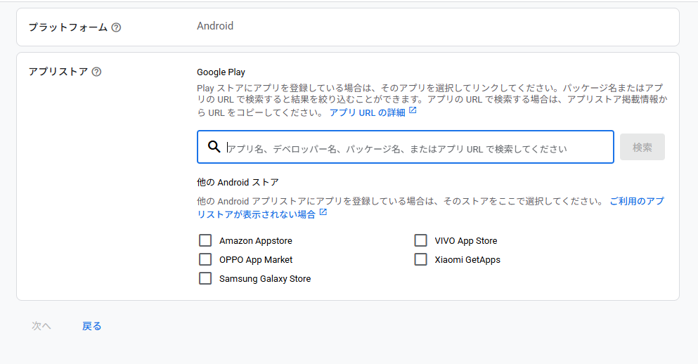 次の画面ではプラットフォームそれぞれのストアに登録されているアプリを紐づけます。