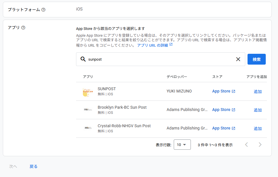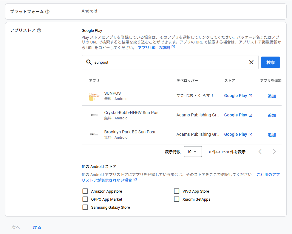 sunpostはリリース済みのアプリになりますので、下の選択肢は「はい、アプリはサポートされているアプリストアに登録されています」を選択してください。