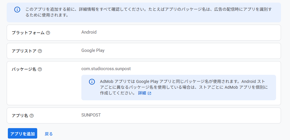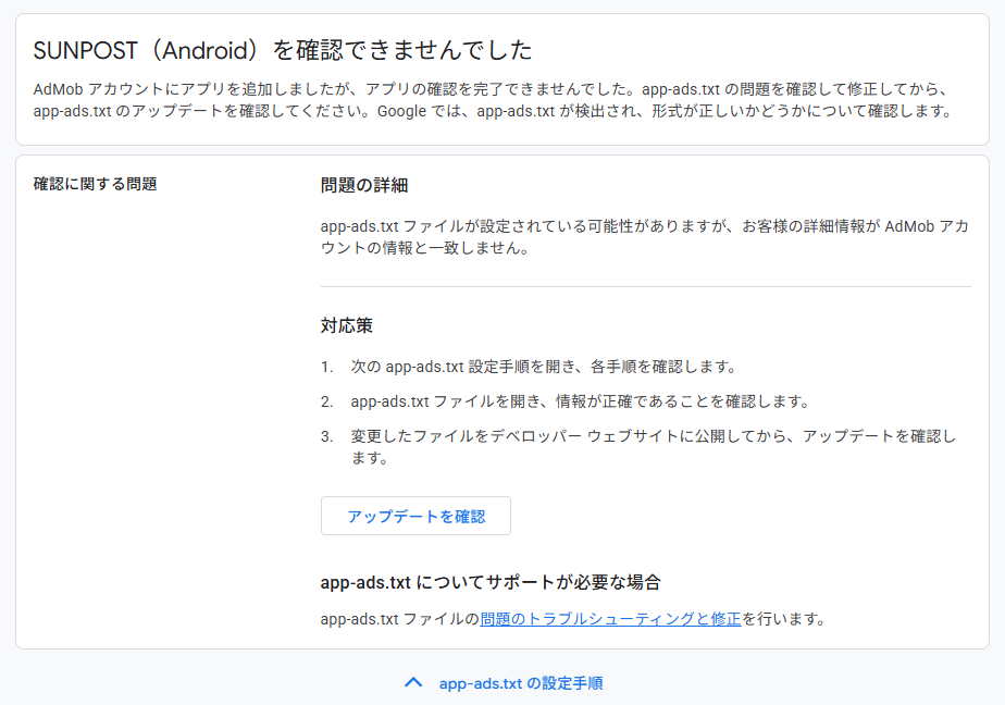 「SUNPOST(Android)を確認できませんでした」と表示されますが、これは制作者のGoogleアカウントとAdmobのGoogleアカウントが一致してないために表示されるもので、問題はありません。