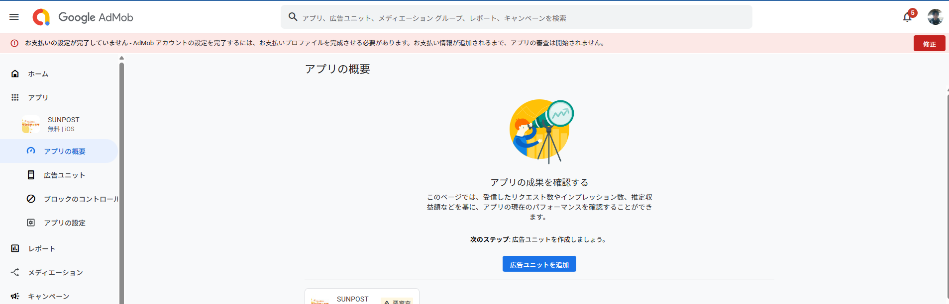 アプリからsunpostの項目を押下した方はこの画面になりますので、中央に表示されている「広告ユニットを追加」ボタンを押下してください。
