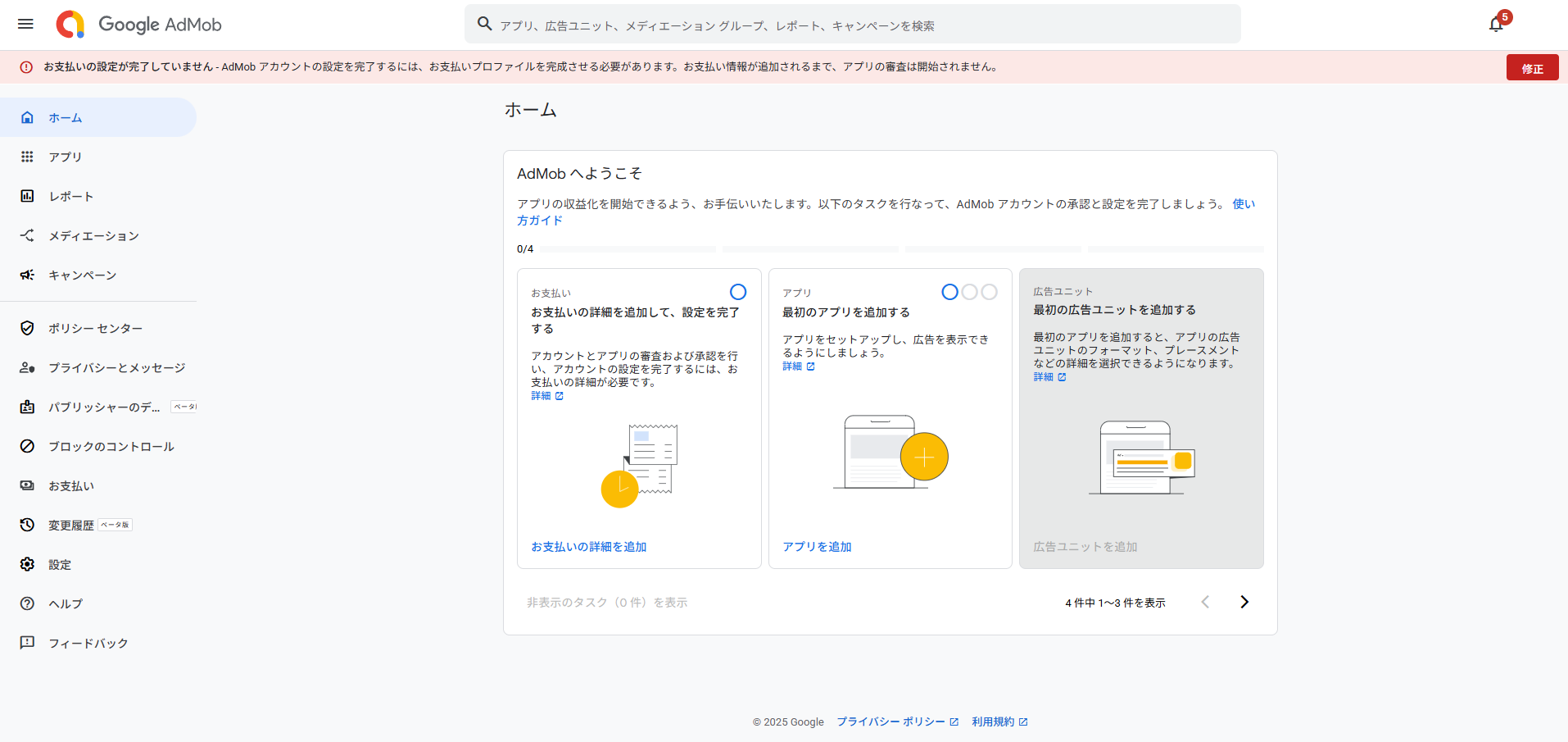 ホーム画面に表示されている「AdMob へようこそ」メニュー、「お支払い」カードの下に表示されている「お支払いの詳細を追加」ボタンを押下して広告収益の支払い先を設定します。